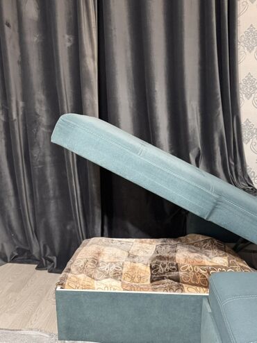 - Обивка из мягкой ткани цвета пыльной бирюзы, декоративная строчка квадратами