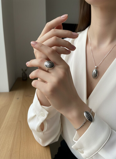 - Материал: металл серебристого цвета, поверхность с черненым орнаментом.