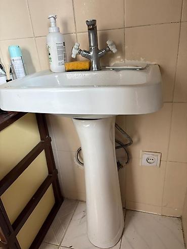 - Раковина на пьедестале (тюльпан) с двумя вентилями на смесителе, стандартное подключение к холодной и горячей воде, перелив. Пьедестал закрывает коммуникации.