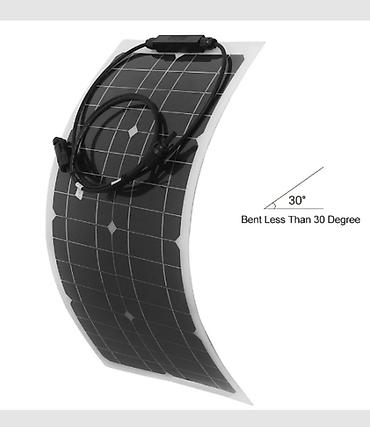 - Гибкая монокристаллическая солнечная панель 100 Вт, рассчитанная на изгиб до ~30°, удобна для установки на изогнутые поверхности (крыши авто, лодки, кемперы, палатки и т.п.).