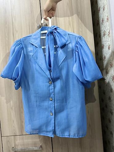 2) Блузка голубого цвета из легкой полупрозрачной ткани. Короткий объемный рукав-фонарик, отложной воротник с лацканами, завязывающийся бант на шее, застежка на ряд декоративных пуговиц-«камней».