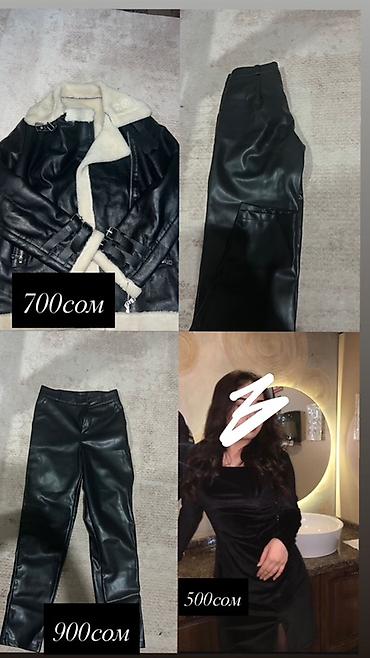 2) Прямые кожаные (экокожа) чёрные брюки. Высокая посадка, шлёвки под ремень, боковые карманы, гладкая фактура. Длина до щиколотки. Цена на фото: 900 сом.
