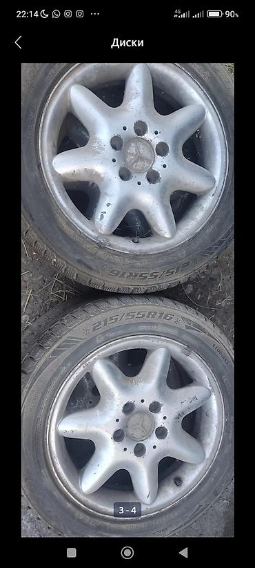 Колёса Mercedes на оригинальных литых дисках + шины 16" Состав: - 4 оригинальных литых диска Mercedes (эмблема на колпаке, классический дизайн «пятилучевые окна»). - 2 шины Bridgestone и 2 шины Mi...