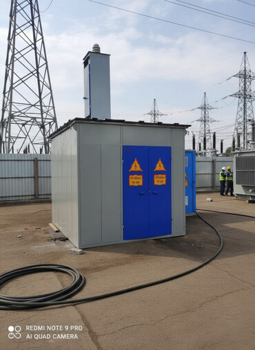 Комплектная трансформаторная подстанция наружной установки (КТПН) в металлическом корпусе. Оснащена двумя дверями с предупреждающими знаками о высоком напряжении. Подходит для электроснабжения пром...