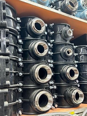 - Конструкция: компрессионные накидные гайки (синие), уплотнительные кольца, корпус из прочного пластика; у седёлок — болтовое стяжное соединение и металлическая резьбовая гильза.