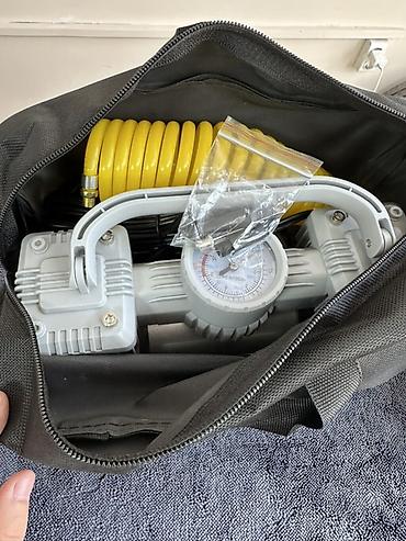 Поршневой высокопроизводительный компрессор для автомобиля. Подходит для подкачки шин легковых авто, внедорожников, мото- и велошин, а также надувных изделий (через переходники).