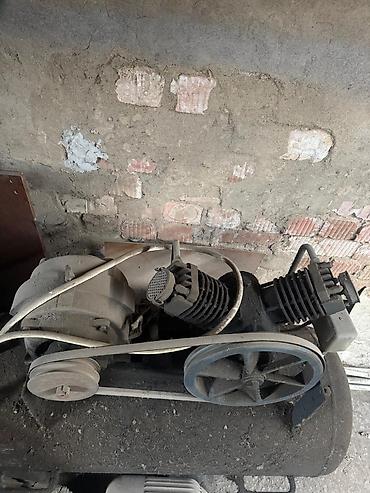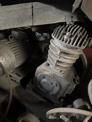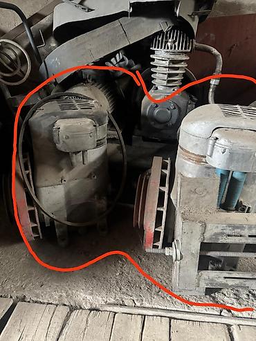 - Поршневые компрессорные агрегаты ременного привода для стационарных установок. Видно несколько головок с ребристым охлаждением, маховиками и креплением под электродвигатель, а также ресиверные блоки.