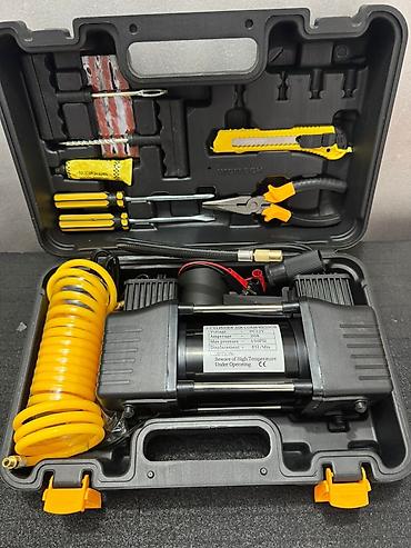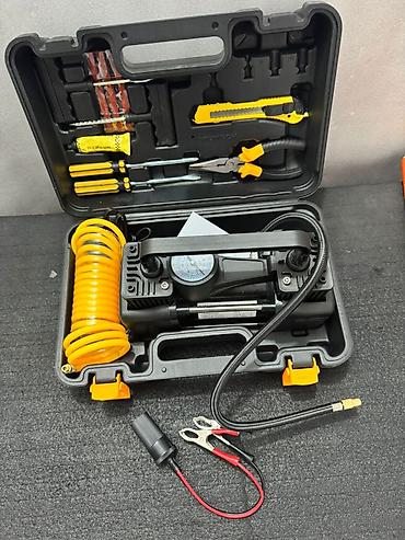 Автомобильный комплект: двухцилиндровый компрессор 12В + набор для ремонта шин в кейсе