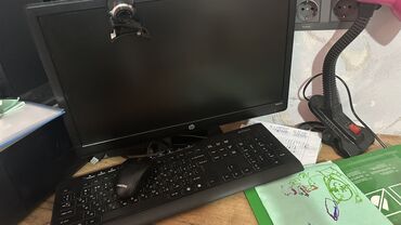 - Монитор HP (широкоформатный, диагональ примерно 22–24"), кнопки управления снизу справа.