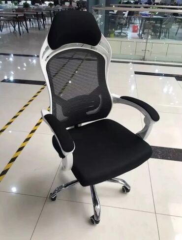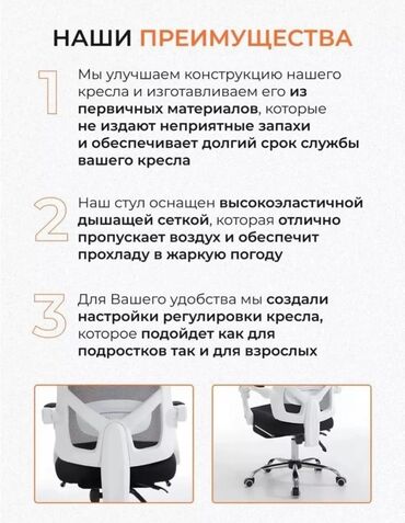 - Современный дизайн: сочетание белого каркаса, черной сетки и сиденья