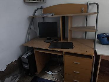 - Компьютерный стол с металлическим каркасом и деревянными полками: