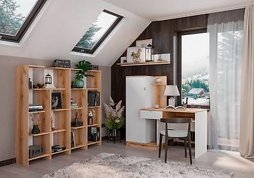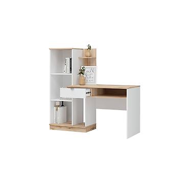 Компактный белый стол с системой хранения. Особенности: - Прямая столешница из ЛДСП, светлый матовый декор. - Слева открытый стеллаж с 3 полками для книг, документов или декора. - Справа тумба с 3...