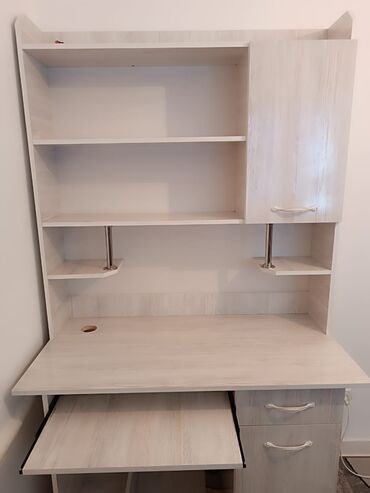 Компьютерный/письменный стол с надстройкой. Характеристики: - Размер столешницы: ширина 100 см, глубина 50 см. - Высота тумбы справа: 75 см. - Материал: ЛДСП светлого оттенка. - Надстройка с множе...