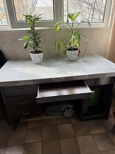 Рабочий/учебный стол с навесным стеллажом и полками . Б/у мкр Кок-Жар .Цена 2000сом - Комплект состоит из широкой столешницы и интегрированной настенной конструкции с открытыми полками разной высот...