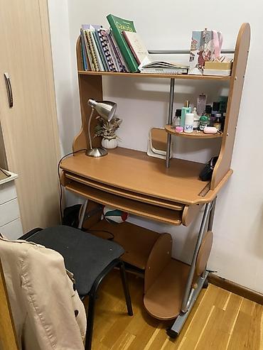 - Верхняя надстройка с широкой полкой для книг и тетрадей, продольный ограничитель, дополнительная круглая угловая полка справа.