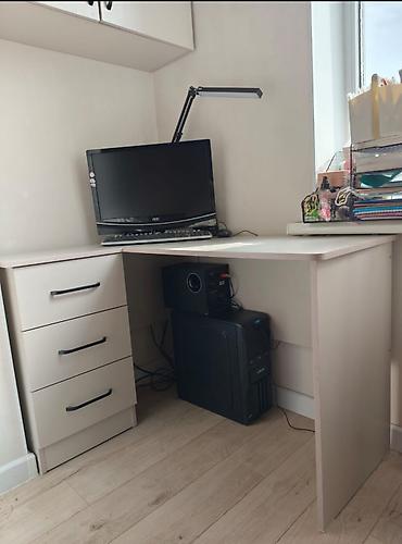 - Просторная столешница с закруглёнными кромками; достаточно места для монитора, клавиатуры, тетрадей/книг, лампы.