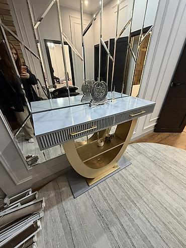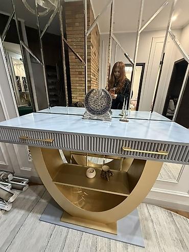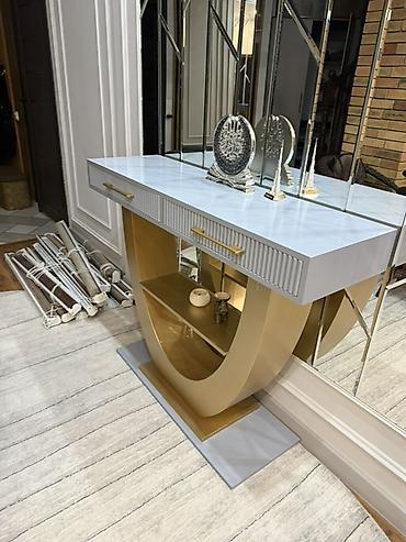 Стол-консоль/ в современном стиле - Столешница: гладкая белая, прямоугольная, с чистыми геометрическими линиями. - Основание: дизайнерские металлические ножки цвета золота в форме «X» — устойчивы...