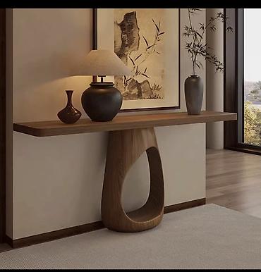 Эффектный акцентный предмет мебели, который одновременно выполняет функцию консоли и декоративной скульптуры, подчеркивая натуральность и спокойную геометрию интерьера.