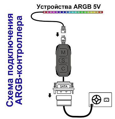Контроллер ARGB не нуждается в поддержке материнской платы и питается по интерфейсу SATA от блока питания компьютера.