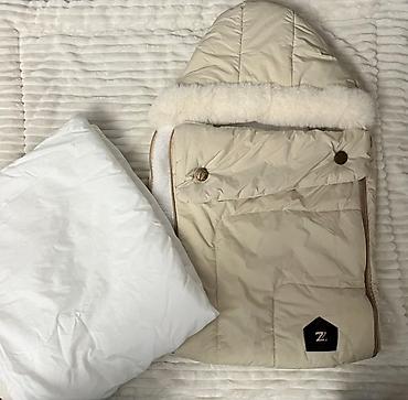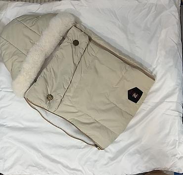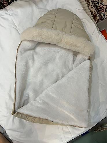 - Теплый зимний конверт бежевого цвета с мягкой опушкой по краю капюшона.