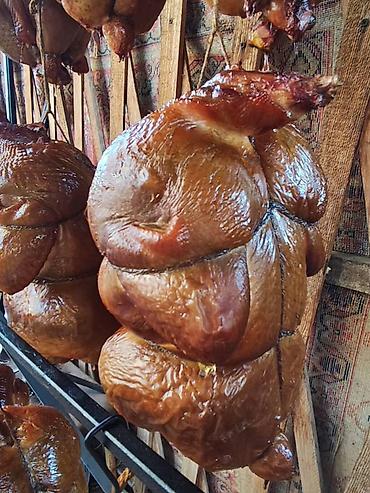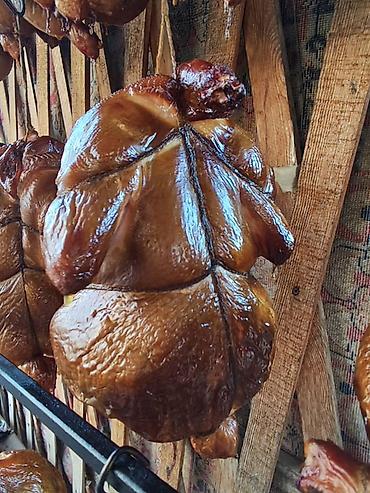 - Традиционное горячее копчение: птица подвешивается целиком и медленно пропитывается ароматом дымка, образуя глянцевую золотисто‑коричневую корочку.