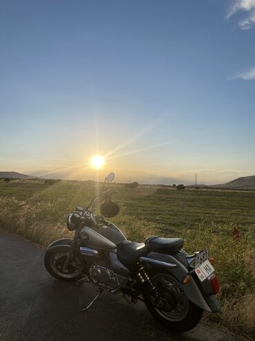 Мотоцикл-круизер Honda Magna (чоппер) черного цвета. Основные особенности: - Классический круглый фаро-блок спереди, хромированная вилка и руль. - V-образный двухцилиндровый двигатель с водяным охл...