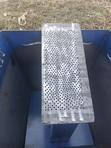- Перфорированные сито-пластины для калибровки фракции; материал проходит через отверстия и выводится через боковой патрубок.