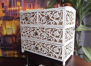 - Авторские шкатулки, сундучки, декоративные короба и мини-комоды с резными фасадами и крышками. Сложные растительные орнаменты, ровные срезы, аккуратные стыки.