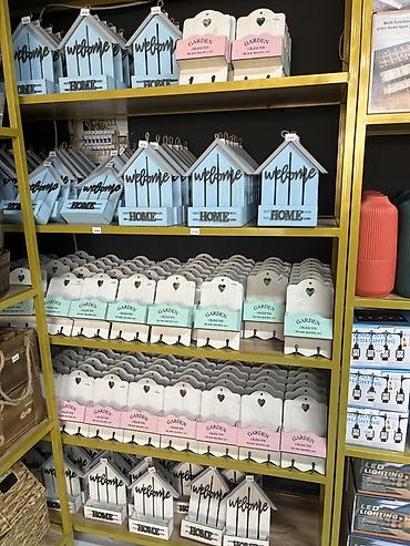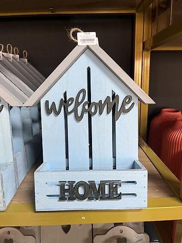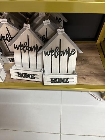 - Домики: объемные слова “welcome” на фасаде и “HOME” на передней планке короба.