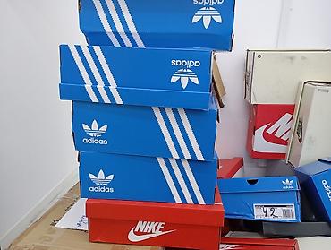 - Фирменные картонные коробки от Adidas (синего цвета с тремя полосками и логотипом Trefoil) и Nike (красные с белым логотипом Swoosh).