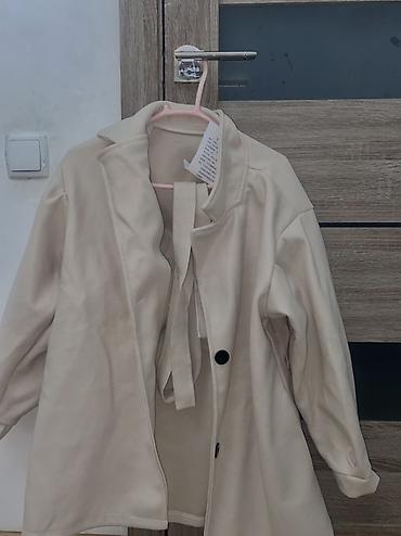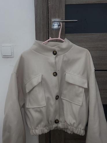 Короткая бежевая куртка-жакет с воротником-стойкой и крупными пуговицами. Это цена за оба предмета; ни один из них ни разу не был надет.