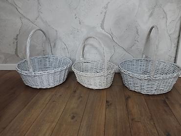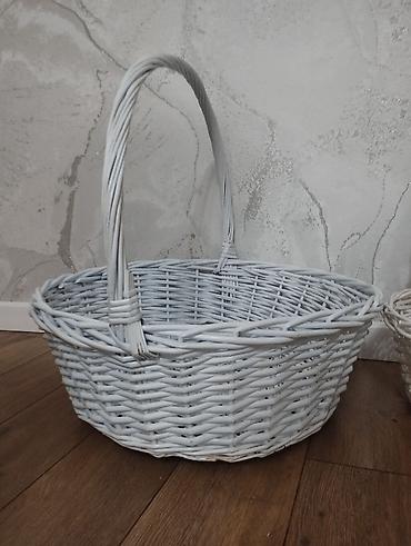Плетёные корзины. Разных размеров и под белыми корзинами пластиковые тазики. Цена : плетенные корзины по 950 сомов каждая, обшитые белым бархатом и со стразами пластиковые тазики по 600 сомов