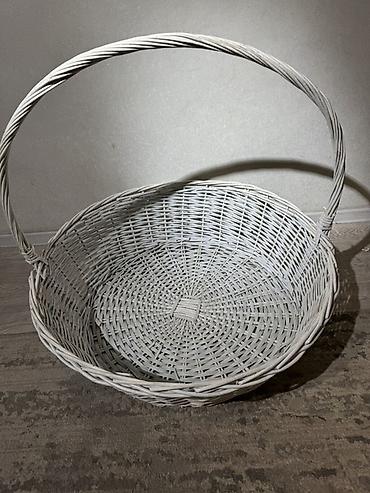 Плетёная корзина с ручкой, белая. б/у в хорошем состоянии Характеристики: - Материал: лоза/ротанг, покраска белой эмалью. - Форма: круглая чаша с высокой фиксированной ручкой. - Плетение комбинир...