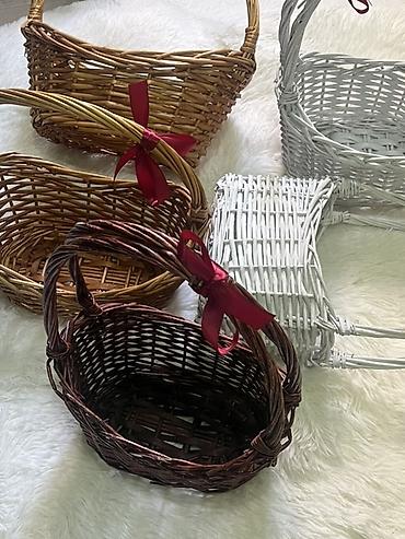 Плетёные корзины из лозы три за 1000 сом - Материал: натуральная ивовая лоза, покрытие – тонирование/покраска. - Модели и цвета на фото: белая круглая мини-кошичка с ручкой; натуральная светлая ко...