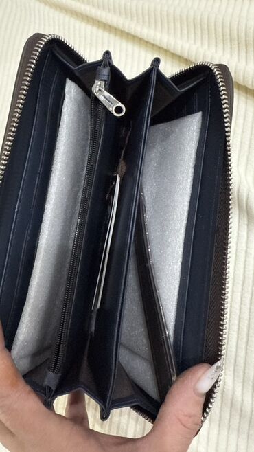 - Внутри: два основных отделения для купюр/смартфона, центральный карман на молнии для монет, дополнительные секции/перегородки для организации, слоты для карт по бокам.
