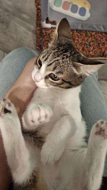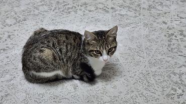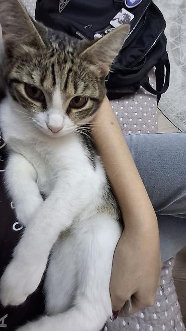 Кошка-подросток, короткошёрстная, окраса табби с белым. Кошке 7 месяцев деньги на стерилизацию дадим. Большие выразительные янтарные глаза, розовый нос, крупные ушки. Спинка и хвост — серо-коричневый тигровый рисунок, грудка, живот и лапки — белые. Компактного телосложения, аккуратные розовые подушечки лап.