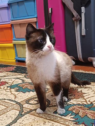 - Окрас: пойнтовый (коричневые «маска», уши, лапы и хвост) с белыми отметинами на мордочке, груди и лапах.