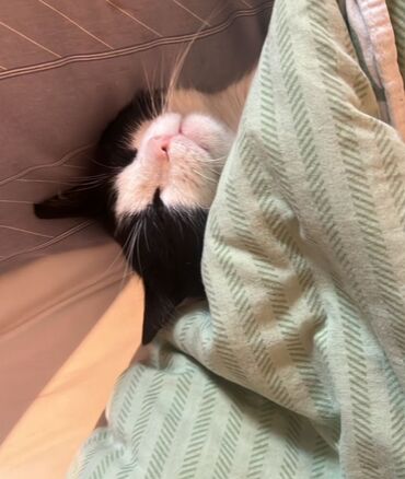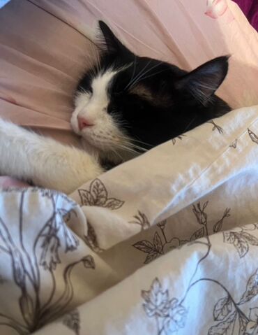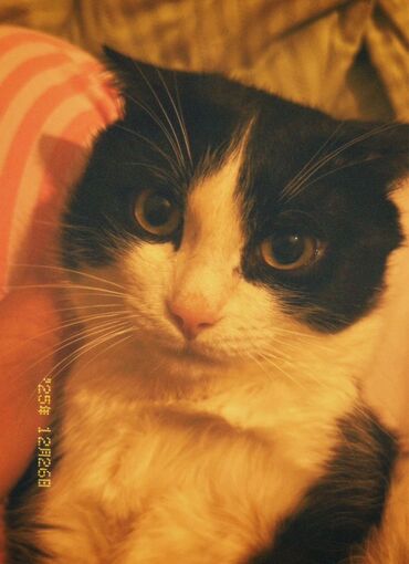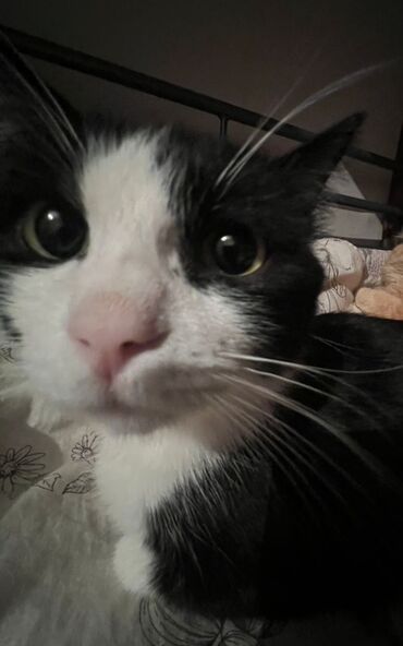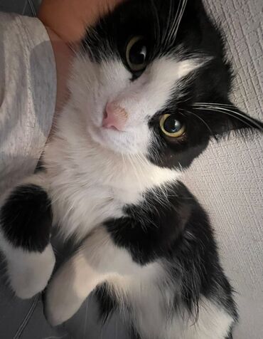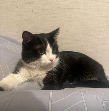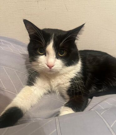 Кошка, чёрно-белый окрас (tuxedo). Крупные выразительные глаза, розовый нос, белая грудка и лапы, контрастные чёрные «носки». Компактное телосложение, средняя длина шерсти, мягкая, легко расчёсывается. Спокойный характер: любит лежать рядом, с удовольствием спит под пледом, охотно позволяет гладить себя. Подходит для домашнего содержания в квартире. Приучена к лотку. Ест сухой и влажный корм. Знает когтеточку, аккуратна с мебелью. Отлично ладит с людьми, быстро привыкает к новым условиям.