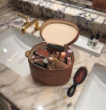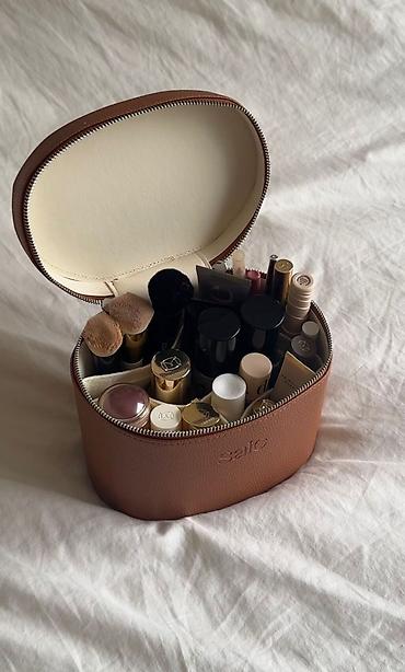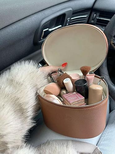 - Форма: круглая/овальная бьюти‑коробка с широким раскрытием крышки на молнии, удобно видеть всё содержимое.