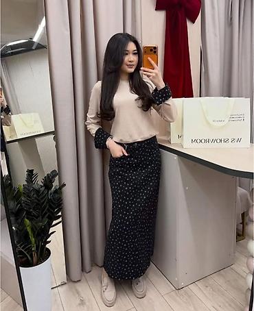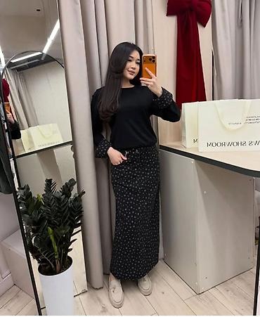 - Два предмета: мягкий однотонный лонгслив с длинными рукавами и отворотами из ткани в звезды; джинсовая юбка макси с таким же звездным принтом.