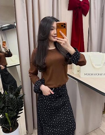 - Лонгслив с круглой горловиной, свободная посадка, контрастные манжеты в тон юбки.