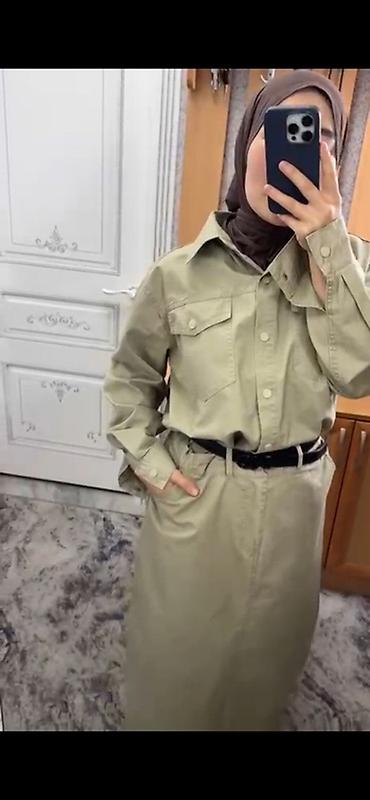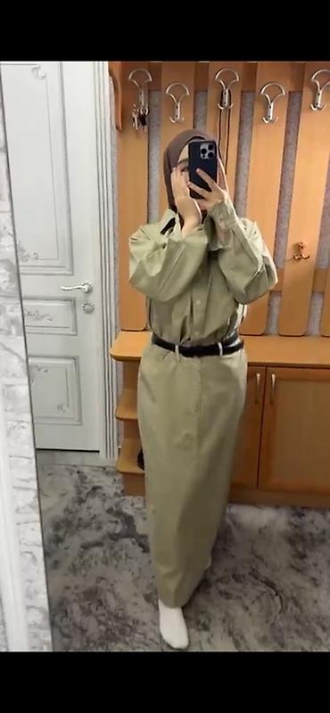 Костюм в стиле сафари из плотного хлопка, цвет хаки. Состоит из рубашки и длинной юбки.