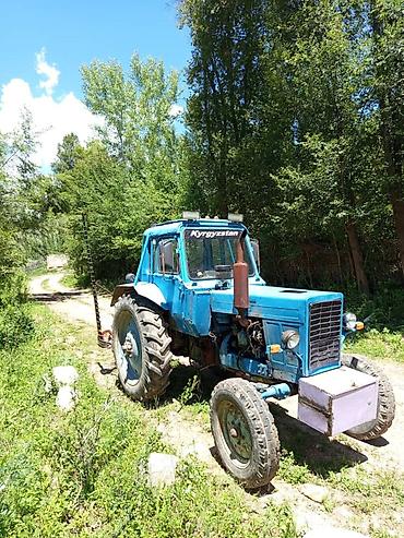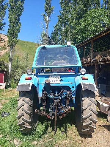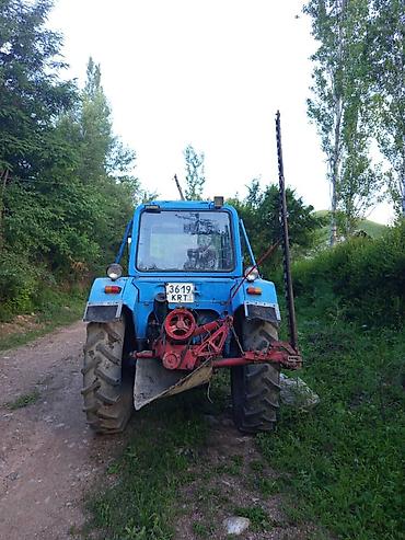 Кошумча куну,мала,косилка,грабил,жаткаКолесный трактор (синего цвета) с кабиной и навесным оборудованием.