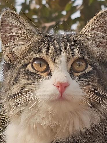 - Пушистая серо-белая кошечка: густая полудлинная шерсть, белый «воротничок» и носик, более спокойная, осторожная, любит наблюдать, тянется к ласке, когда привыкает. Аккуратная, знает лоток при наличии.