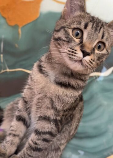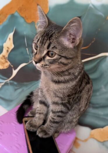 - Окрас: классический «табби» (серо-коричневый с чёткими тёмными полосами и отметинами на мордочке).