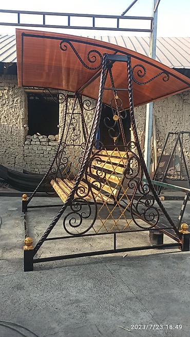- Элегантные качели для двора/сада с художественной ковкой: изогнутые стойки, ажурные завитки и декоративные элементы.