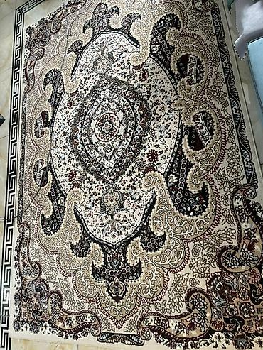 - Цвета и орнамент: бежево‑молочная база с узорами в чёрных, коричневых, бордовых и серых тонах; центральные медальоны и растительный арабесковый рисунок. Рамка с тонкой бордюрной полосой по периметру.