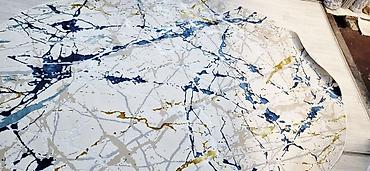 - Дизайн: современный абстрактный «мраморные брызги» — светлая база (молочно-белая/беж) с контрастными прожилками и мазками синего, темно-синего, голубого, серого и золотисто-охристого.