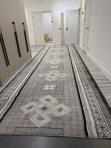 Рулонные ковры (Ковровые дорожки) нейтральных оттенков и с разнообразными узорами. Представлены варианты с абстрактными геометрическими рисунками, вертикальными полосами, а также однотонные мягкие ...