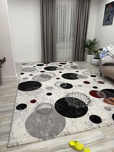 Ковры для дома — набор из двух изделий в нейтральной серо‑чёрно‑белой гамме. 1) Ковер для гостиной - Форма: прямоугольный. - Цвета/дизайн: светлая основа с крупными кругами черного, серого и бордо...